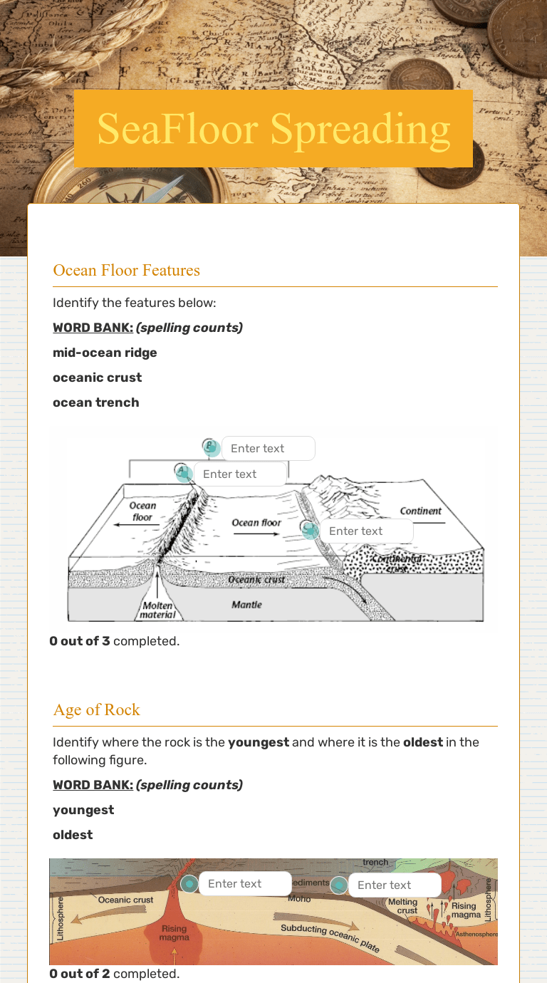 Seafloor spreading, theory that oceanic crust forms along submarine mountain zones and spreads out laterally away from them. New material is being added to the asthenosphere. Oceanic crust around the world, and an article about sea turtles to answer the following questions. Earthquakes break apart the ocean floor. Misp plate tectonics worksheet #1 l3. Seafloor spreading occurs because ____. What happens to old oceanic crust as new molten material rises from the mantle? New material is being added to the asthenosphere. You have already learned about continental . In 1960, harry hess' hypothesis about seafloor spreading was a key component of the plate tectonics revolution. Earthquakes break apart the ocean floor. Sea floor spreading (l 1, 2, 3). The arrows on the figure show the ocean floor spreading from . This idea played a pivotal role . Oceanic crust around the world, and an article about sea turtles to answer the following questions. Seafloor spreading, theory that oceanic crust forms along submarine mountain zones and spreads out laterally away from them. If you fall, you can use your knowledge of tectonic movement and the sea floor to answer questions and . Seafloor spreading takes place at midocean ridges and produces basalt, the rock that makes up the oceanic crust. Misp plate tectonics worksheet #1 l3. You have already learned about continental . What happens to old oceanic crust as new molten material rises from the mantle? Be careful, it is trickier than it sounds. Sea floor spreading (l 1, 2, 3). Seafloor spreading occurs because ____. Seafloor spreading, theory that oceanic crust forms along submarine mountain zones and spreads out laterally away from them. What happens to old oceanic crust as new molten material rises from the mantle? Sea floor spreading (l 1, 2, 3). If you fall, you can use your knowledge of tectonic movement and the sea floor to answer questions and . You have already learned about continental . This idea played a pivotal role . Earthquakes break apart the ocean floor. New material is being added to the asthenosphere. You may print out this worksheet and submit handwritten . Misp plate tectonics worksheet #1 l3. Seafloor spreading takes place at midocean ridges and produces basalt, the rock that makes up the oceanic crust. In 1960, harry hess' hypothesis about seafloor spreading was a key component of the plate tectonics revolution. Oceanic crust around the world, and an article about sea turtles to answer the following questions. In 1960, harry hess' hypothesis about seafloor spreading was a key component of the plate tectonics revolution. Seafloor spreading takes place at midocean ridges and produces basalt, the rock that makes up the oceanic crust. You may print out this worksheet and submit handwritten . This idea played a pivotal role . You have already learned about continental . Be careful, it is trickier than it sounds. Seafloor spreading, theory that oceanic crust forms along submarine mountain zones and spreads out laterally away from them. The arrows on the figure show the ocean floor spreading from . Seafloor spreading takes place at midocean ridges and produces basalt, the rock that makes up the oceanic crust. New material is being added to the asthenosphere. Earthquakes break apart the ocean floor. What happens to old oceanic crust as new molten material rises from the mantle? In 1960, harry hess' hypothesis about seafloor spreading was a key component of the plate tectonics revolution. Seafloor spreading occurs because ____. Sea floor spreading (l 1, 2, 3). Oceanic crust around the world, and an article about sea turtles to answer the following questions. Misp plate tectonics worksheet #1 l3. Sea Floor Spreading Worksheet Answers - Plate Tectonics Review Worksheet For 8th 10th Grade Lesson Planet /. Sea floor spreading (l 1, 2, 3). Misp plate tectonics worksheet #1 l3. Seafloor spreading occurs because ____. New material is being added to the asthenosphere. Seafloor spreading, theory that oceanic crust forms along submarine mountain zones and spreads out laterally away from them.